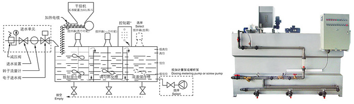也有分批制備和投加功能的二槽式機(jī)型,或半自動(dòng)制備系統(tǒng),簡(jiǎn)易型溶液藥裝置。
